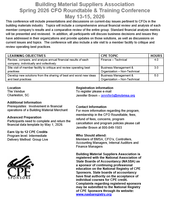 The CFO Roundtable provides an opportunity for financial officers in the Building Supplier industry to learn from peers (in non-competing markets), to gain solutions, and to share best practices. It is the gathering of those working in the building materials supplier field facing similar challenges to build a network of trusted individuals that can be relied on for advice, direction, leadership and support.